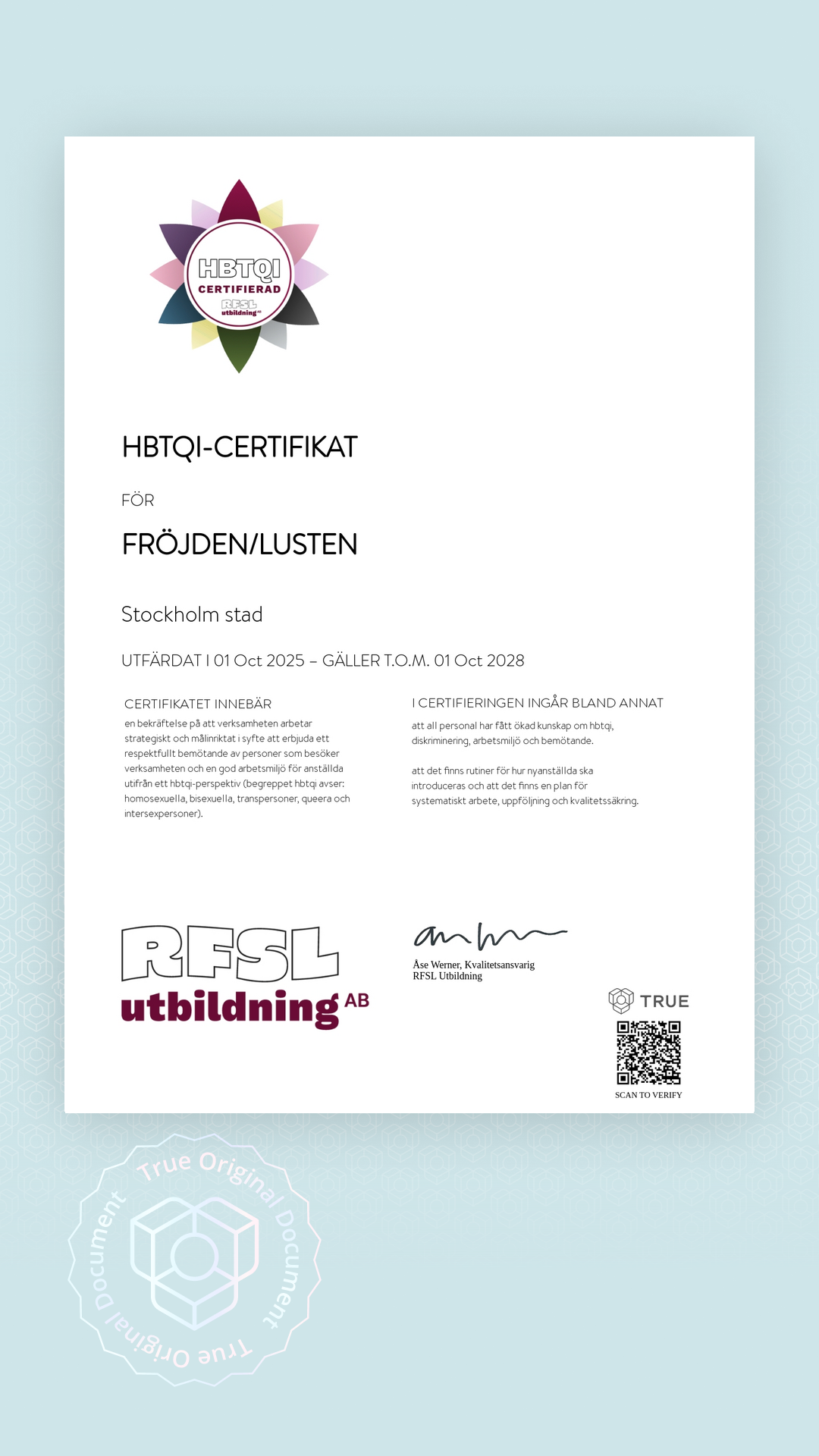 Hbtqi-certifiering är en process där en verksamhet med stöd av RFSL påbörjar, eller förstärker, ett strategiskt arbete med syfte att skapa en trygg arbetsmiljö och ett hbtqi-kompetent bemötande.
