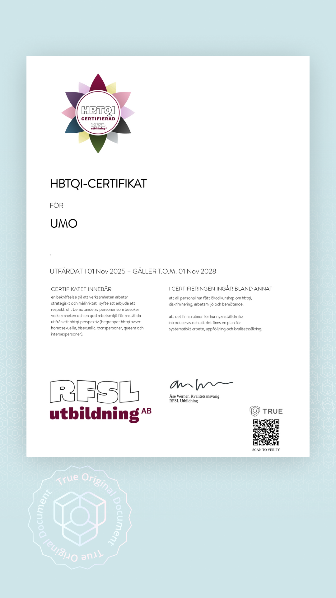 Alla TRUE -document är säkrade med blockchain-teknologi och kan verifieras som äkta. Klicka på verifieringsknappen bredvid dokumentet eller skanna QR-koden med din smartphones kamera. Ingen app krävs - dokumentets äkthet verifieras omedelbart.