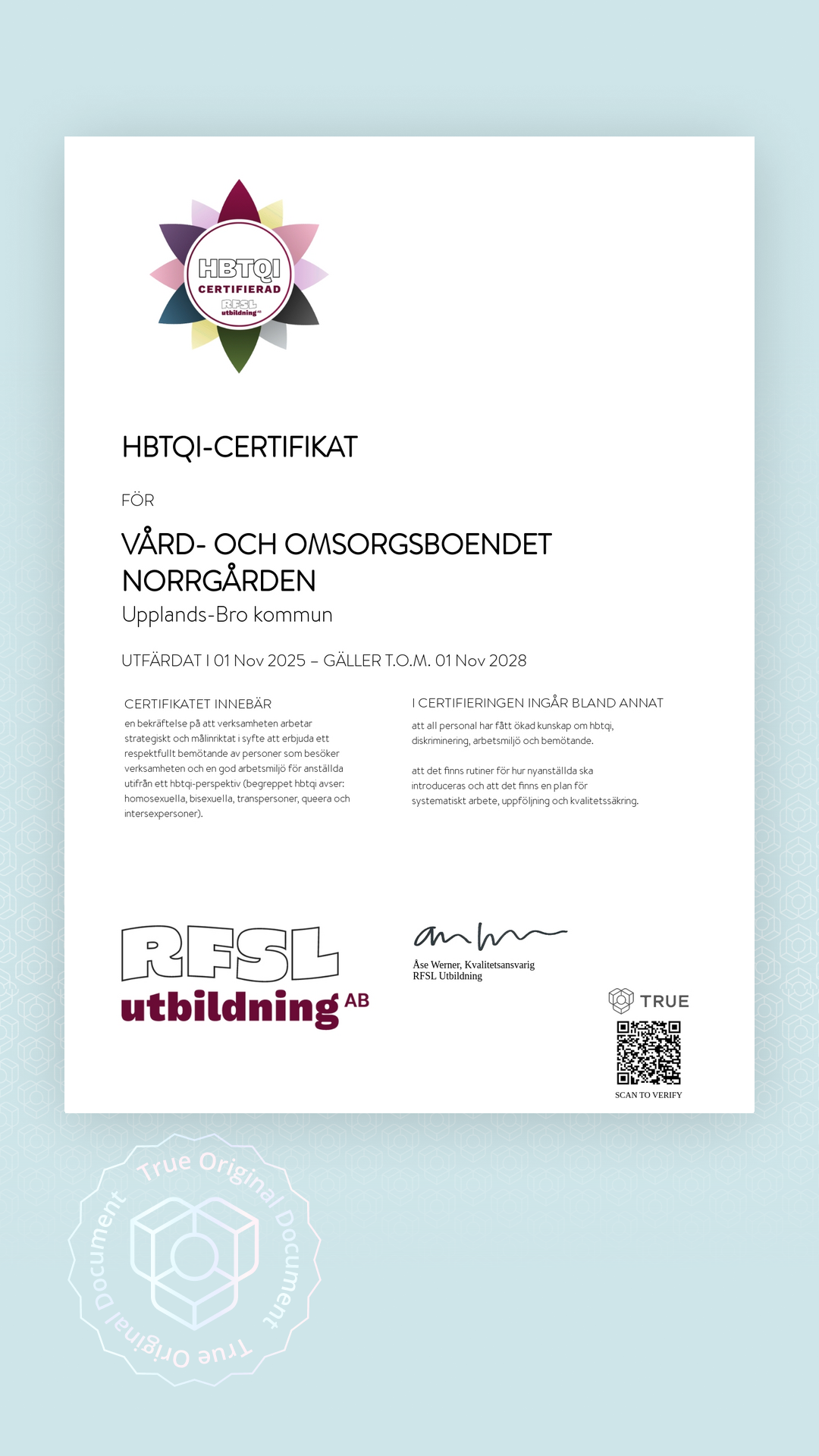 Alla TRUE -document är säkrade med blockchain-teknologi och kan verifieras som äkta. Klicka på verifieringsknappen bredvid dokumentet eller skanna QR-koden med din smartphones kamera. Ingen app krävs - dokumentets äkthet verifieras omedelbart.